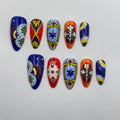 Adorn your fingertips with these captivating handmade press-on nails! Featuring intricate, hand-painted Mexican Talavera tile art patterns in a vibrant palette of blues, oranges, and yellows. Reusable and customizable, these unique fingernails are perfect for festivals, cultural events, or making a bold, cheerful statement in daily wear.